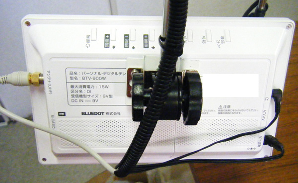 テレビ部裏面の配線アンテナ・電源・イヤホンのケーブルをアームに沿って配線しています。モールで通しているので配線の見た目が目立ちません。 テレビ側の配線も写真のように、無駄なく接続できます。 9インチのテレビサイズは、アーム式テレビとしてちょうど良いサイズ。また、軽量で扱いやすいものになります。 |