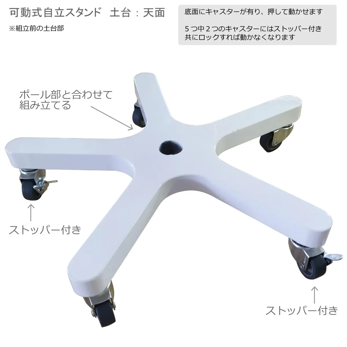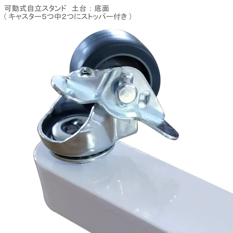 ※可動式自立スタンドはキャスター付きで、押して動かせます。またストッパーで動かないようにも出来ます。